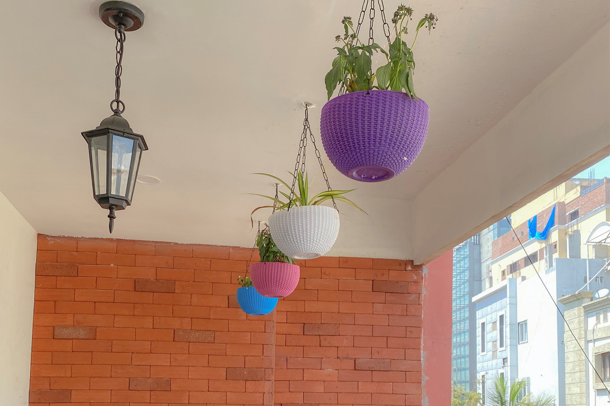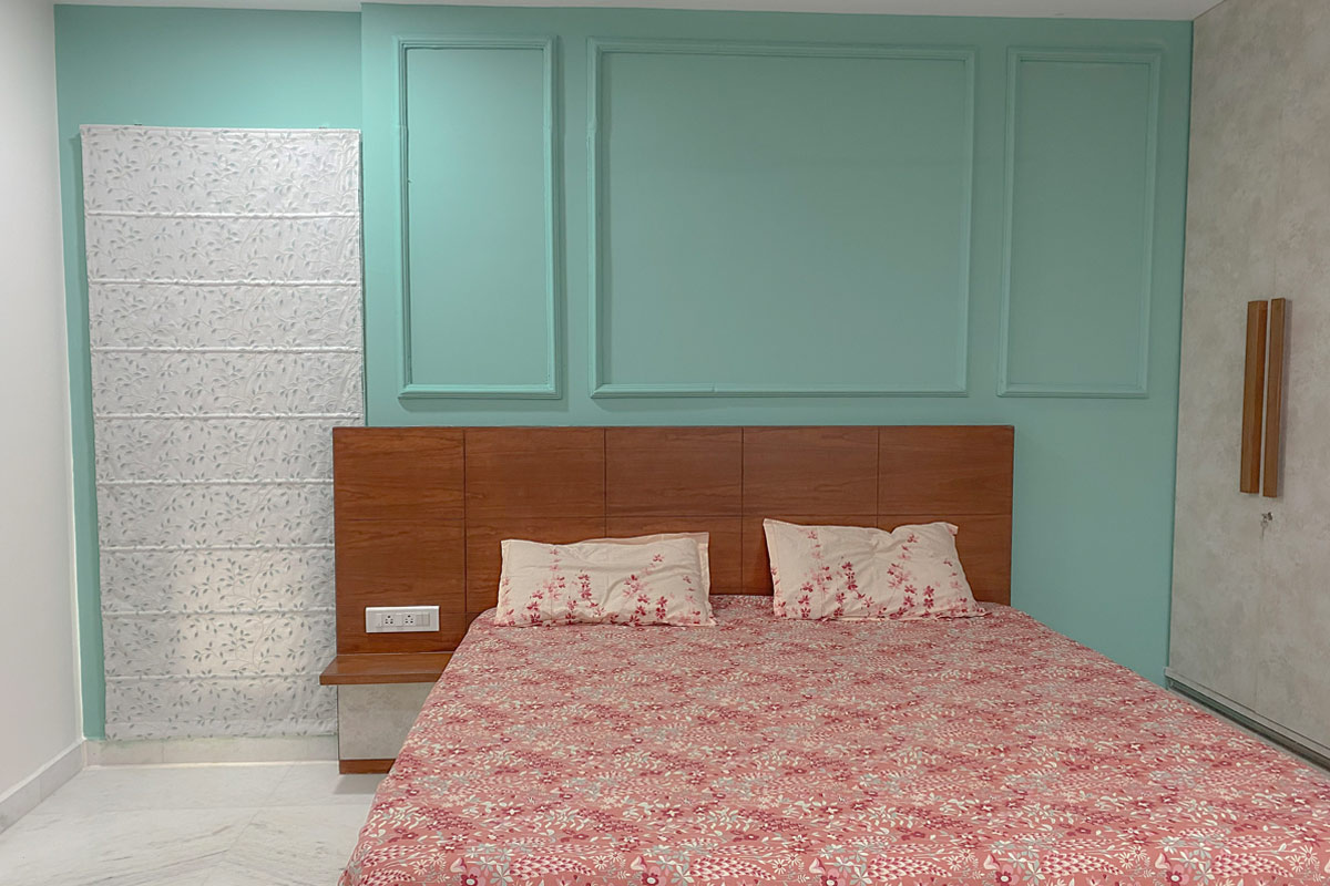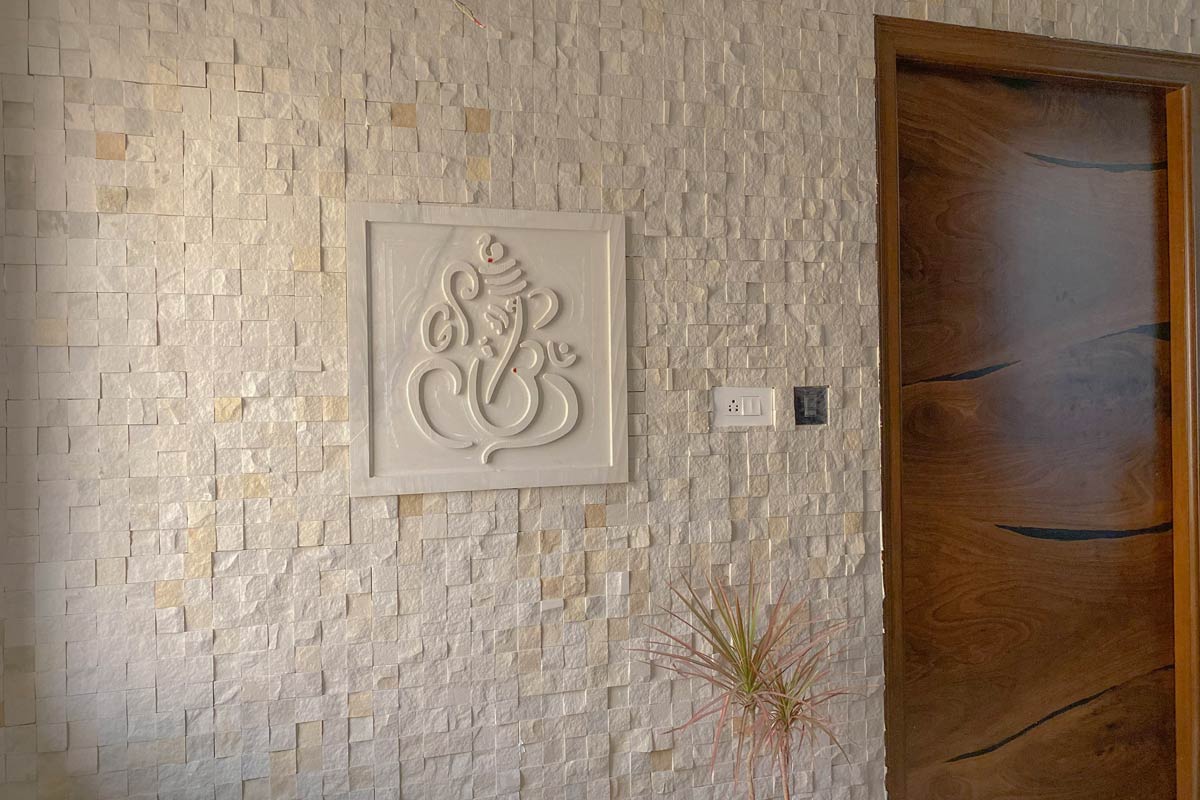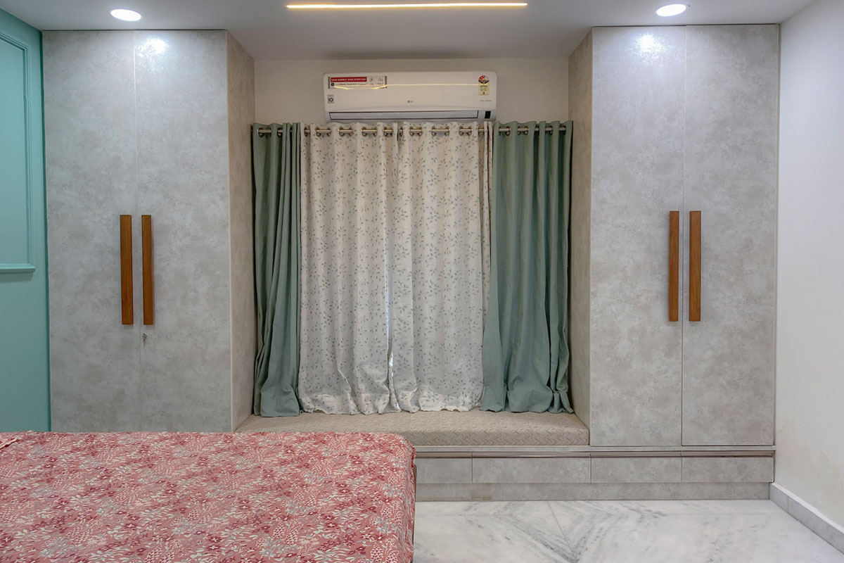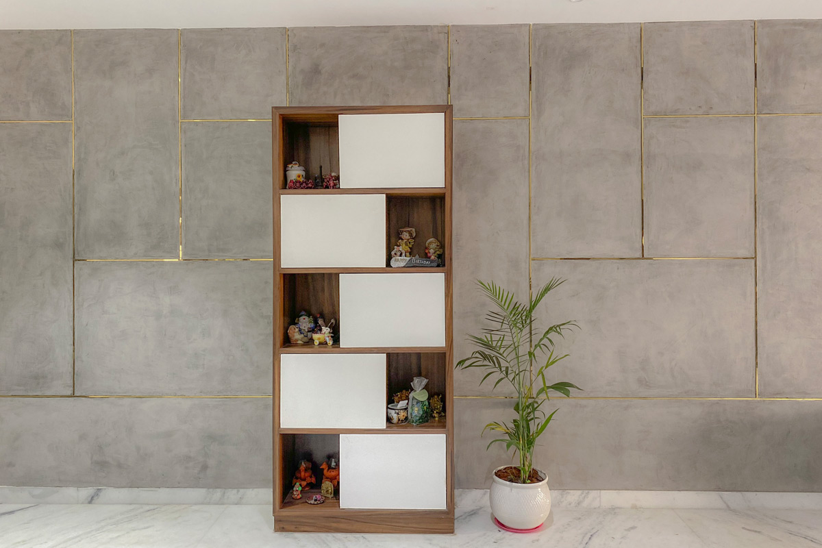 Complete interiors for a 3 BHK apartment in Hyderabad for a family of four. The home is packed with a lot of different textures and finishes like the cement texture wall with brass beading in the living room, brick wall in the balcony and stone tile cladding at the entrance. Though the rooms are planned as per individual requirements, the texture and design theme is maintained throughout the house. Premium veneer finished woodwork in living area, marble flooring for the entire apartment, acrylic finish for kitchen cabinet shutters and high-end hardware lends a sophisticated vibe to the entire space. The apartment has an open floor plan with a huge living room. The living dining space is separated by a wooden partition with storage unit and shelves for displaying accessories.