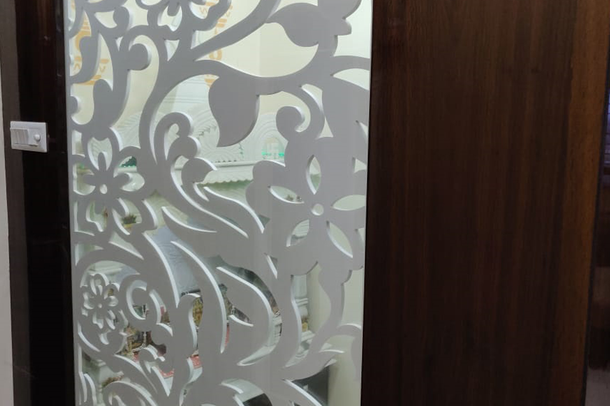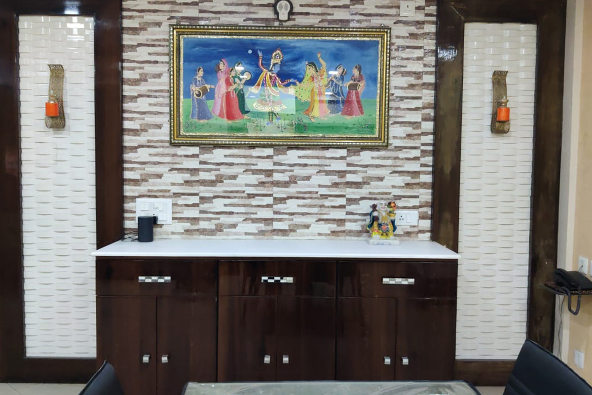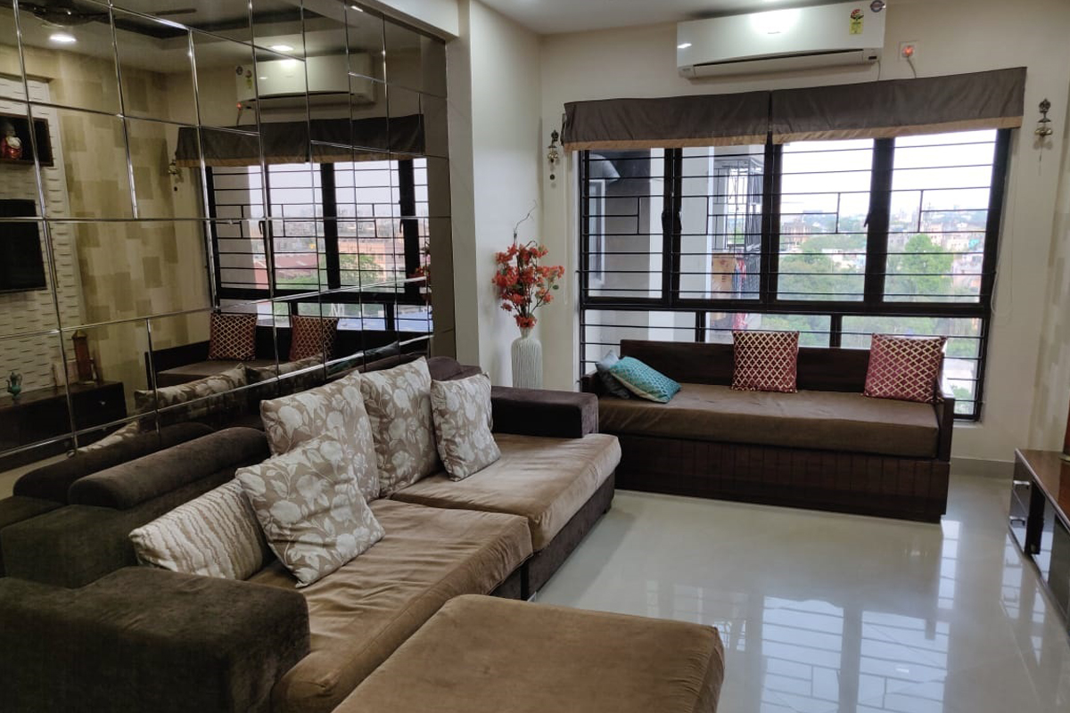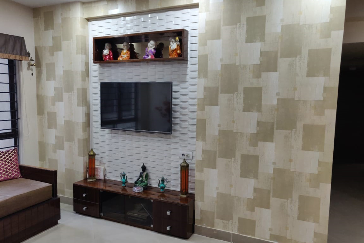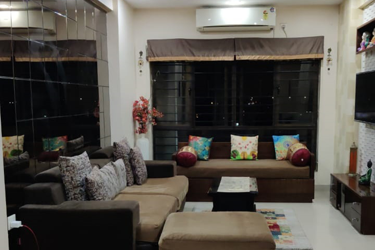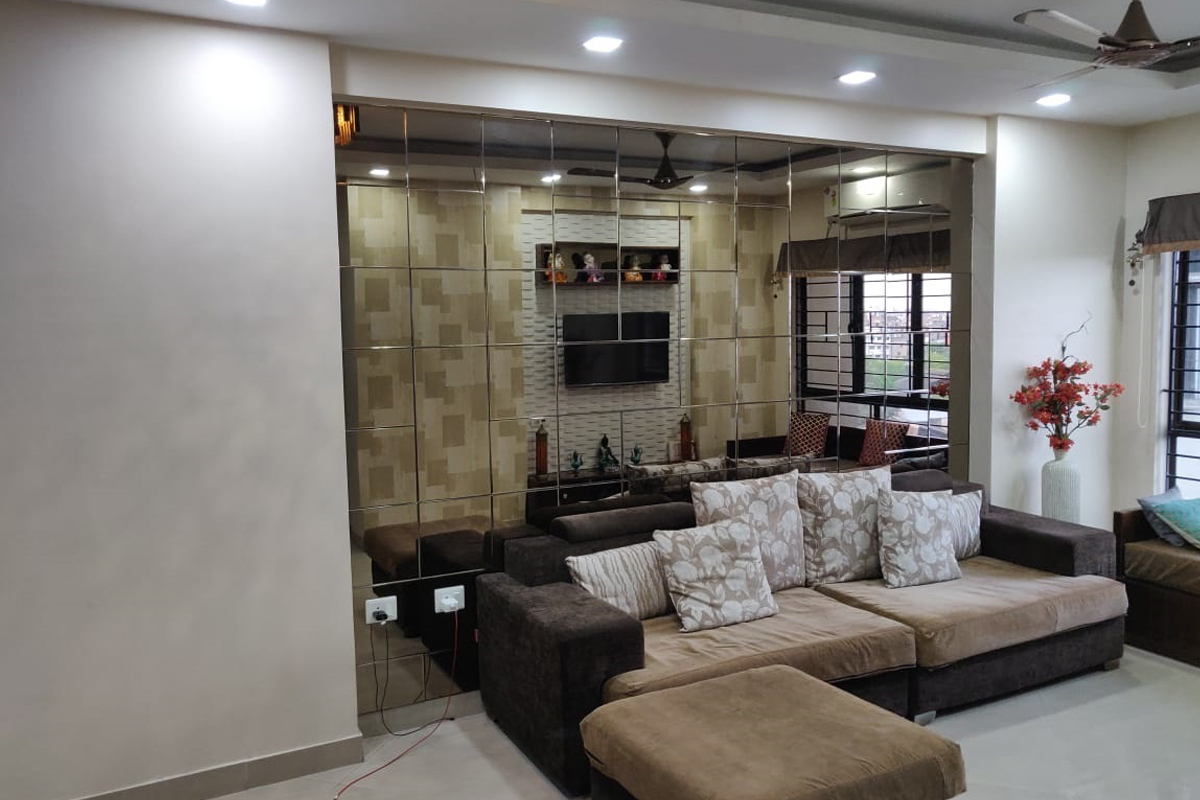 For this 3BHK apartment in Kolkata we chose a contemporary theme in clean lines and functional interiors. Brown tinted mirror on one wall of the living room gives the illusion of a bigger space. The interiors are adorned with earthy colours to keep the ambience warm and cosy. Lacquer veneer finish in woodwork lends a sophisticated vibe. Play of textures and patterns provide a sense of uniqueness with underlying cohesiveness.